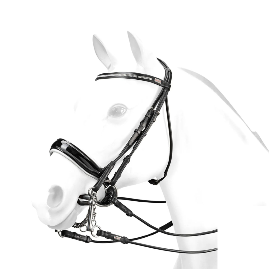Designed for Charlotte Dujardin, it features beautiful rolled leather, a patent “KING” noseband with white trim & shining crystal browband.